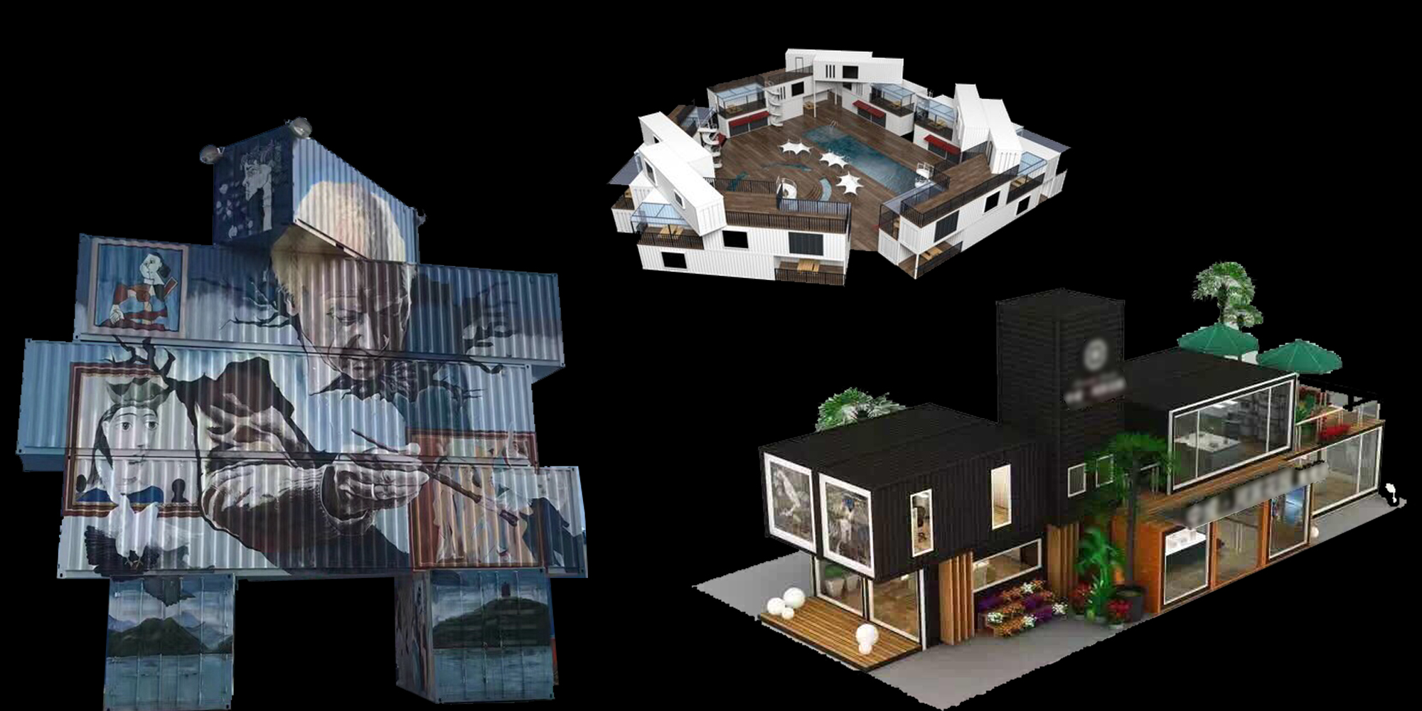 轻钢结构,集装箱样式框架、集成各类新型节能建筑装饰材料,高端大气。